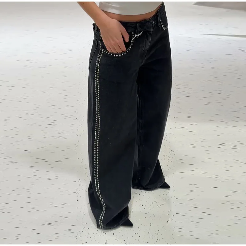 A Vittoria traduz a força e a ousadia do jeans preto com um toque de sofisticação, graças ao trabalho de aplicação de tachas metálicas que contornam bolsos e laterais da peça. Com modelagem ampla e cintura baixa, entrega um visual urbano e moderno, perfeito para quem quer se destacar sem abrir mão do conforto.